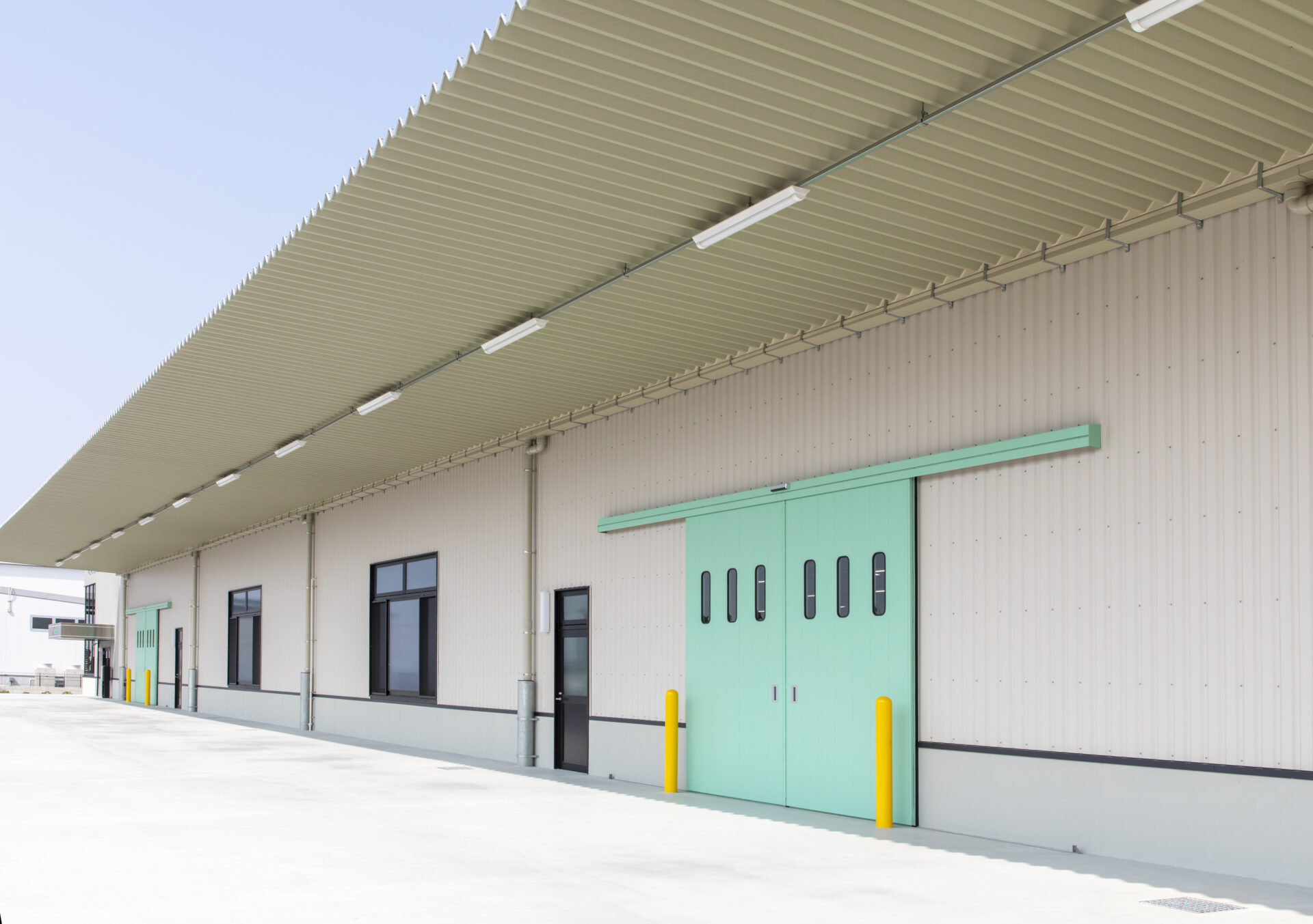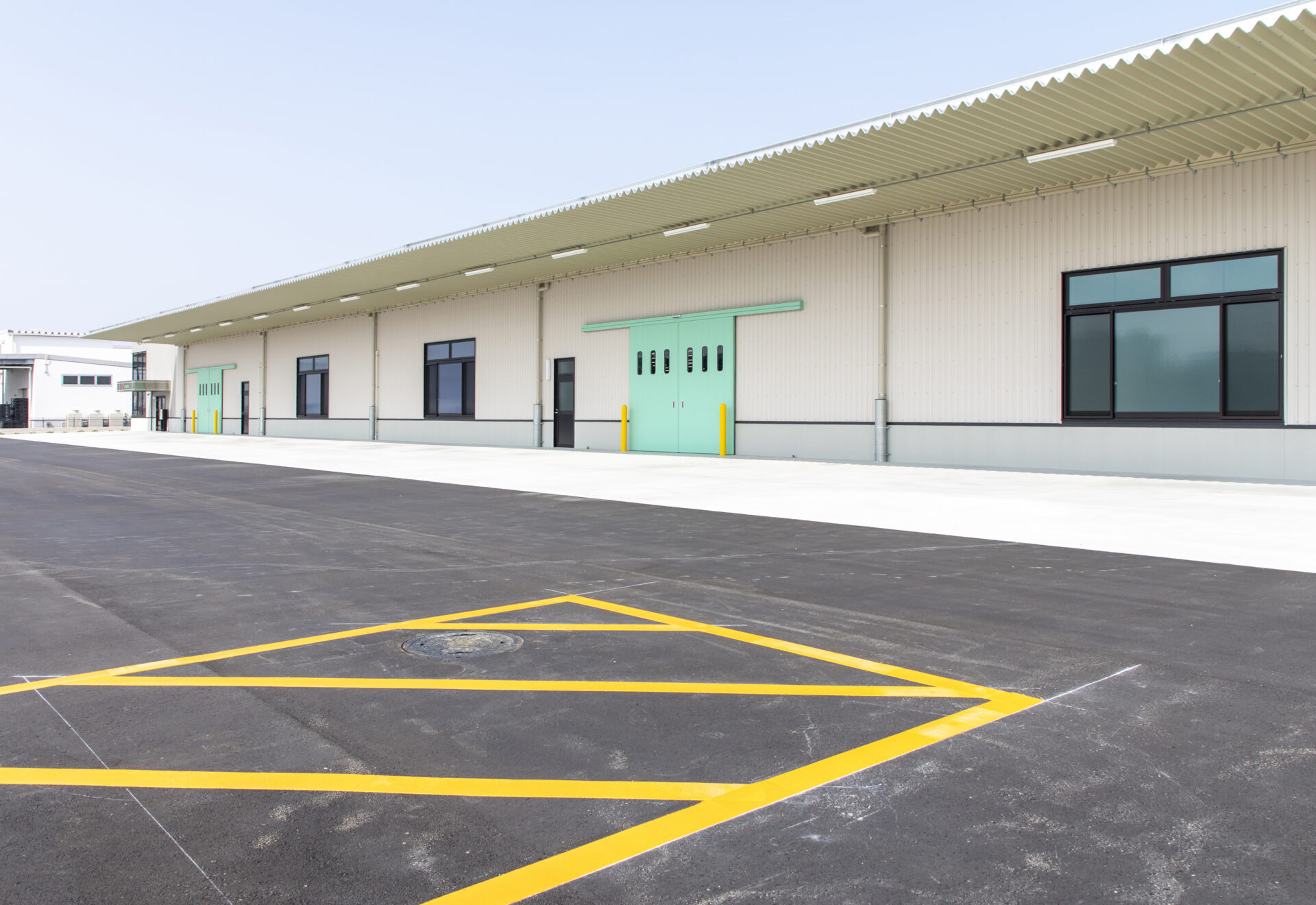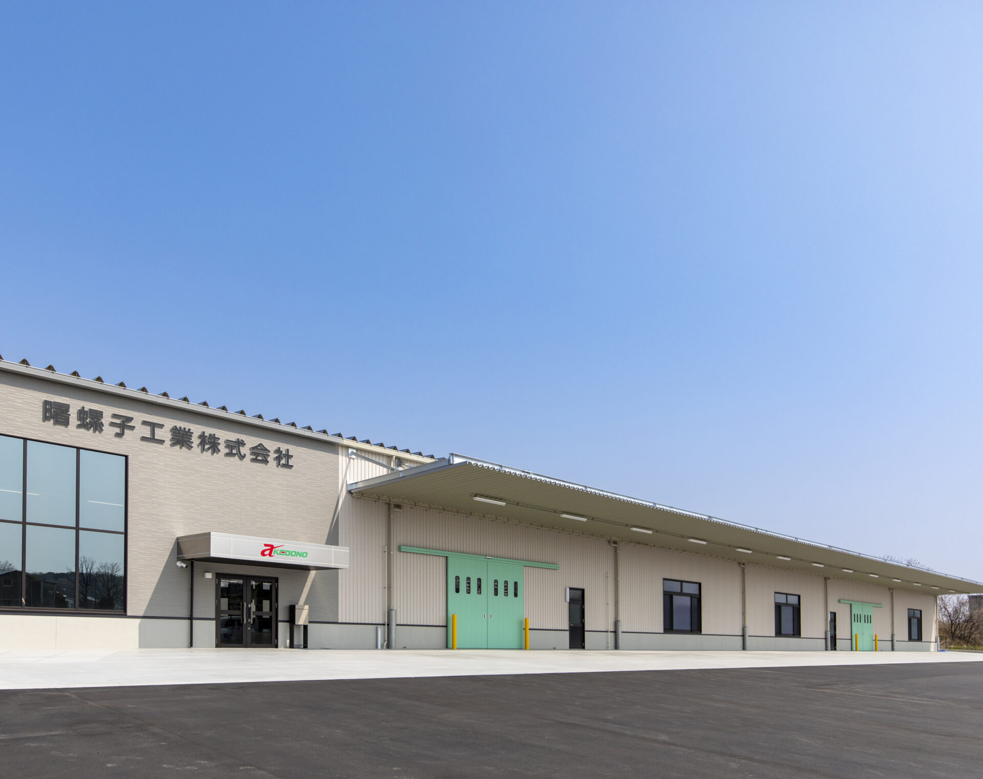建物は鉄骨ラーメン構造の平屋とし、工場としての機能性と効率的な動線計画を重視しました。外壁・屋根にはガルバリウム鋼板を採用し、耐久性・メンテナンス性に優れた仕様としています。シンプルでありながら印象的な外観デザインとし、企業イメージ向上にも寄与する仕上がりとしました。