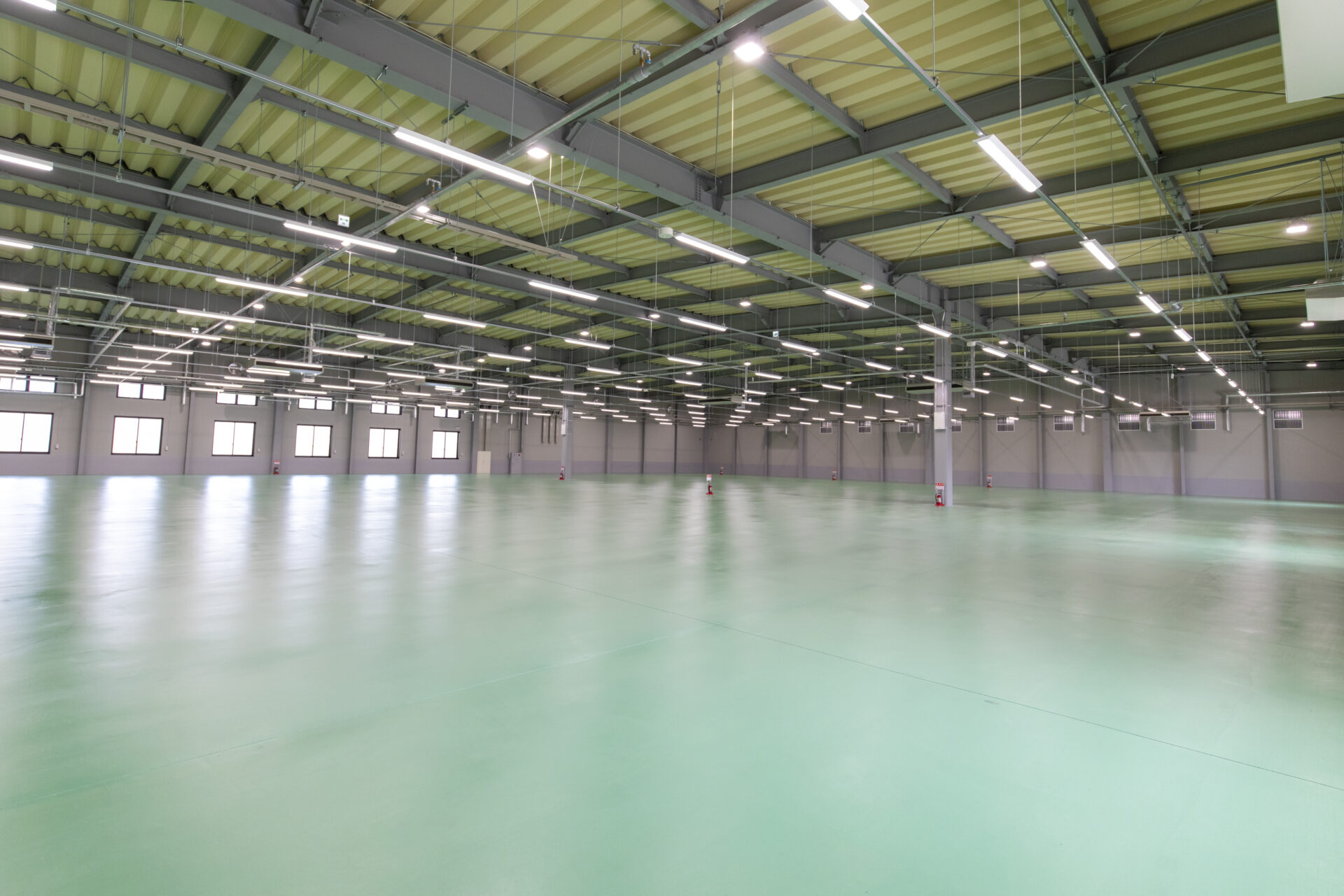 完成後は、広大な空間でありながら床精度が高く保たれており、設備設置や運用開始後もスムーズな稼働が可能となりました。均一な照明環境により視認性も向上し、作業効率の改善にもつながっています。