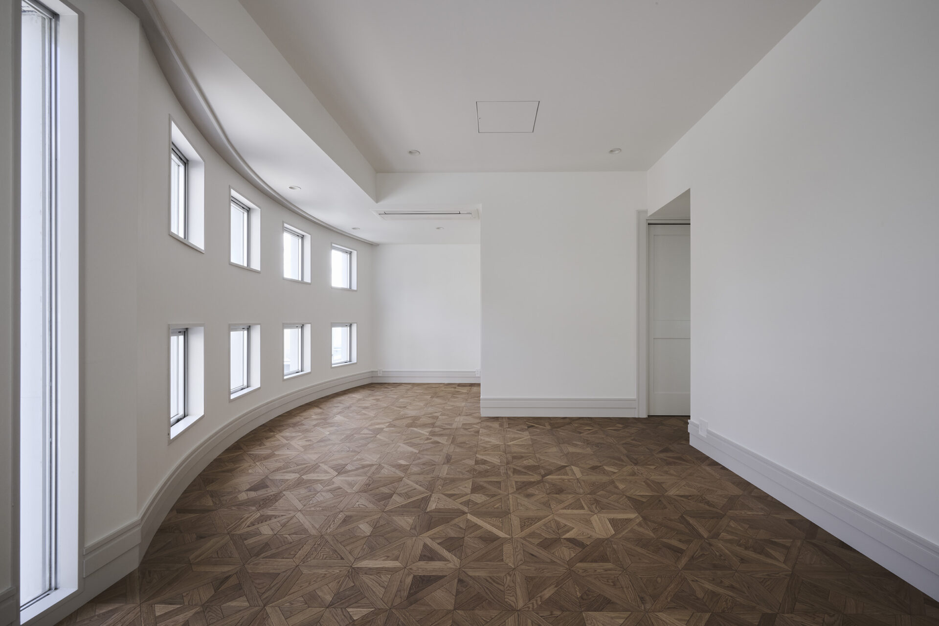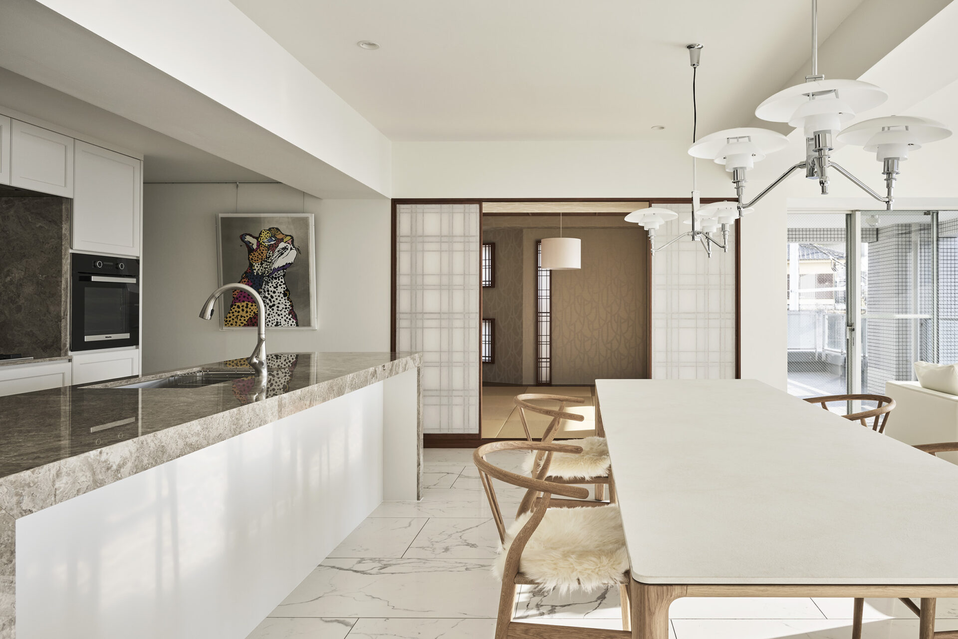 内装は白を基調とし、床・キッチン・浴室・洗面・トイレに至るまで、大理石を中心とした上質な素材を採用。床にはイタリアから輸入した大理石を使用し、自然光を柔らかく反射させることで、室内全体が明るく広がりのある印象となるよう計画しました。