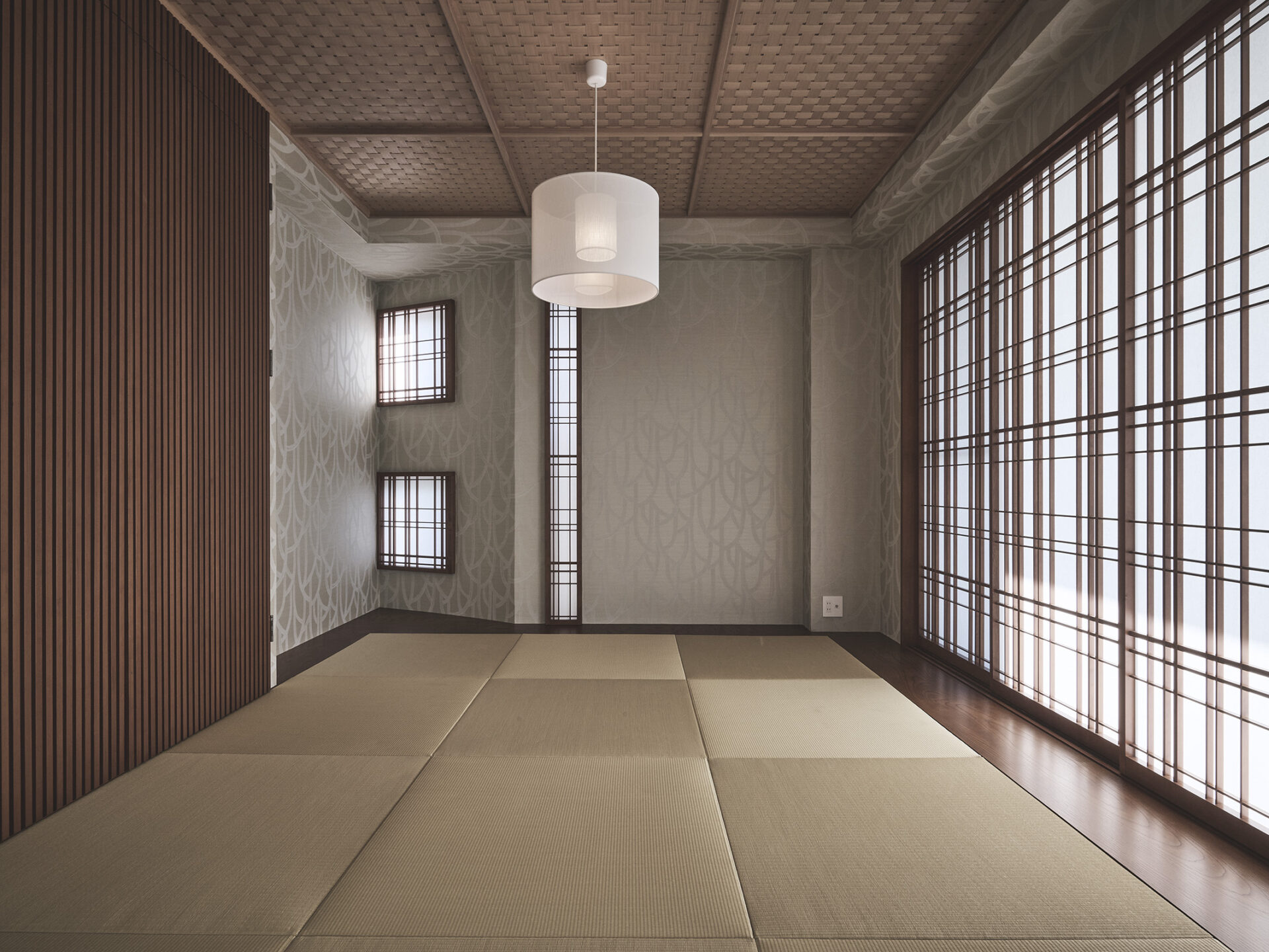 和室は、網代天井(本物)や輸入クロス、琉球畳を採用。障子にはタータンチェック柄となるよう組子の配置やバランスを細かく調整し、素材選定だけでなく施工技術によっても通常の和室とは異なる特別感を演出しました。