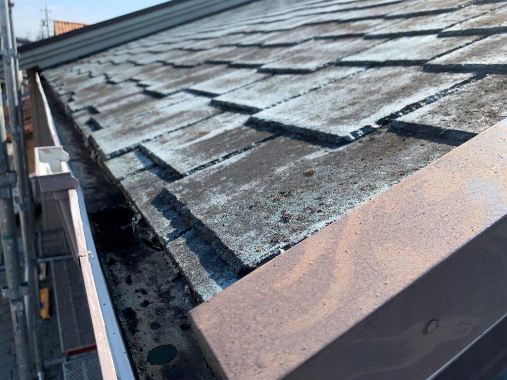 工事前はスレート屋根の色あせや表面の劣化が進み、遠目にも「屋根の古さ」が目立つ状態であった。屋根は建物の印象を左右する大きな要素であるため、外観不良が気になり始めると、住まい全体の価値や清潔感にも影響が出やすい。さらに、屋根材の表面が劣化すると雨水をはじく性能が落ち、将来的な防水性の低下や耐候性の低下につながる懸念もある。そこで今回は、既存屋根を撤去せず再塗装で保護性能を回復させ、見た目と機能の両面を改善する方針となった。